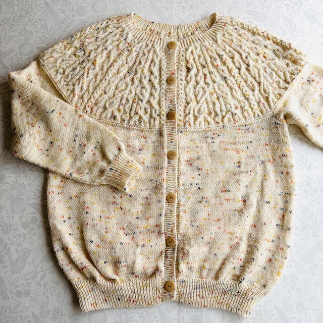 使用糸はユザワヤのカラフルテイルハンドダイで、クリーム色にオレンジ、黄色、グレーの粒が散った可愛い色合いです。