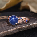 センターストーン: 7mm ラウンドカット ラボ ブルースターサファイア (ブルー スター サファイアがさまざまな角度で回転すると、それに応じて 3 つのスター ラインも動きます)