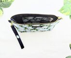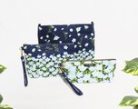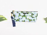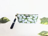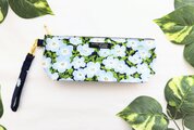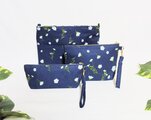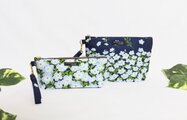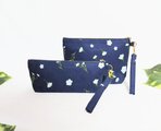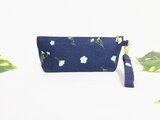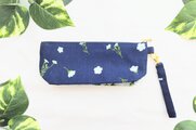 ネイビーの薄手綿シーチング生地に可愛いネモフィラの花柄、ちょっと大きめサイズの持ち手付きペンケースです。