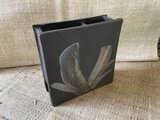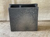 奥行きがないので狭いスペースにも置けます。 縦、横15センチ。厚み5センチ。重さがあるので安定しています。 炭化焼締めによる艶のある黒っぽい色合いです。
