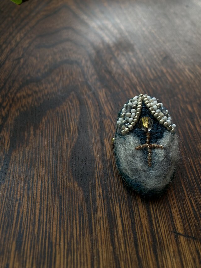 ウール、アンティークビーズ、現代ビーズ、刺繍糸、豚革、真鍮メッキ
