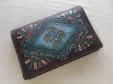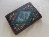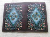 白革に刻印を配列し、拭き染めという技法で自家染色しました。