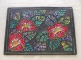 白革に刻印を配列し、拭き染めという技法で自家染色しました。