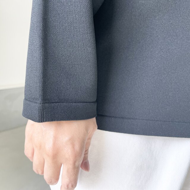 生地はポリエステル100%の12ゲージニットで、高品質な度詰めの編み目により、滑らかな肌触りと洗練された美しい目面を実現しました。
