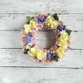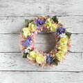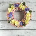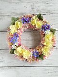 まるで春の花畑を切り取ったかのような色合いの明るいリースです。