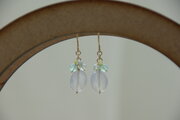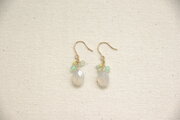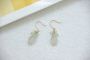 晴れた日の空に浮かぶ雲のようにやわらかな色合いのカルセドニーをピアスにしました。表面は美しくカットされ、うっとりするような光沢があります。また、陽にかざすと内側があめ色がかって見えます。主役の持ち味を活かしつつ、のっぺりした印象にならないよう小さな石たちでスパイスを効かせました。