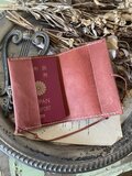 レザーアンティーク調ローズ色と紐巻きデザインがオシャレなパスポートカバーです。