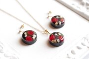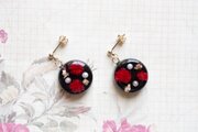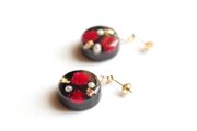 黒い背景に鮮やかな深紅の花とパールを浮かべた、シックでエレガントなピアス。