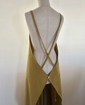 背中でクロスする肩ひもタイプで、肩紐をそれぞれの通し口に通し、結び止めをつくって被るだけのスタイルにしたり、