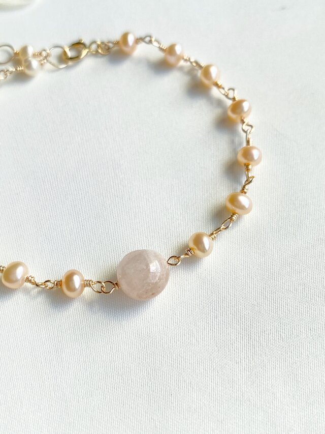【4月誕生石】14kgf モルガナイトと淡水パールのブレスレット シェルピンク ac/1071