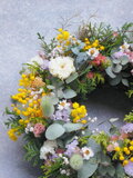 ユーカリ(5種)・オウゴンヒバ・コノテガシワ・ティーツリー・ラナンキュラス(雪てまり)・アネモネ・ミモザ(アカシア スペクタビリス)・ミツマタ・カスミソウ・スターチス(5種)・花かんざし・ラグラス・藤のツル