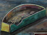夜の浜辺だろうか、浜辺の小さな生き物たちが木箱の中に採集されている。