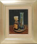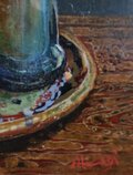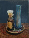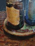 左の小瓶は、樹脂と油の溶剤が入っていたもので茶褐色に染まっています。右は、一輪挿しです。その中にはワインのコルクの蓋が落とされています。