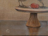 この風合いを消さない控えめな絵の具層で仕上げています。木彫りの小鳥は私の作品にはよく登場するモチーフです。小さな舞台の二羽の小鳥、鳥たちの囀りが聞こえてくるだろうか。