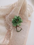三つ葉と四つ葉で花束にし、葉だけのシンプルなコサージュに仕上げました。