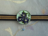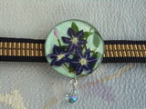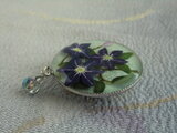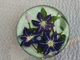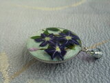 淡水色と玉虫色を使って作った地色に紫の鉄線の花を描いています。