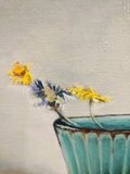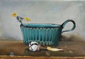 花瓶に飾られた花々、花瓶に花を飾る時にいつの間にか小さな花が溢れたり、やちぎれたりして幾つかテーブルに落ちていたりする。まだ青々として生命力のある花、拾い上げて器に入れて水を注げば、