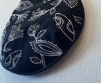 黒地の帆布生地に2色の綿麻混糸でミシン刺繍をしました。