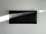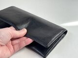 通常は内折りにマチを作るところ、外折りの"風琴マチ"構造にする事で、お札との引っ掛かりをなくし、お札を大量に入れても厚さを抑える構造を実現しました。カードポケットはお財布に対して横向き設計にする事で、カードの抜け落ちを防止。その背面には汎用性のあるフリーポケットを搭載させ、より収納力の高い構造にしました。更にカードの容量を拡張出来るカードホルダー#1( ※1 )との互換性を持たせ、追加で10枚・本体と合わせて計14枚のカード収納を可能にしました。折り紙のような直線で構成された造形美と、あえて傷やエクボが見えるパーツ取りで革本来の個性を全面に出した、自然体な佇まいが魅力です。ひとつとして同じ表情はなく、日常の中で自分だけの色艶へと変化する深い味わいをご堪能頂けます。手にした瞬間に感じるアマンダオイルの「フカっとした手触り」と、緻密に施された巧みな職人技を感じて頂けると幸いです。