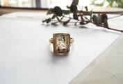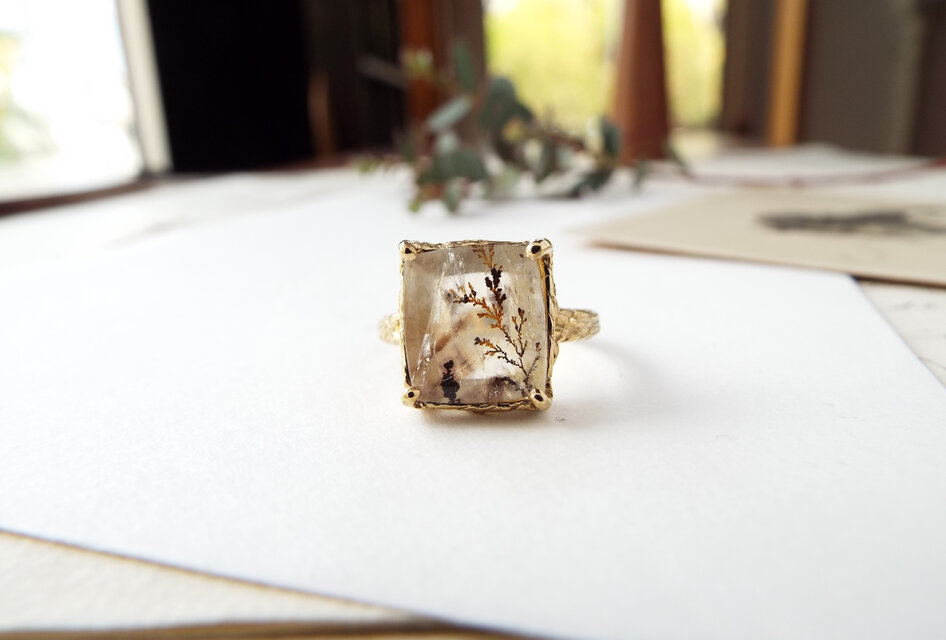 樹木のように見えるのが特徴の「デンドリティッククォーツ」を、「身に着ける植物標本」のイメージでリングにしました。