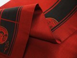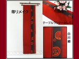 ■新品の帯をリメイクしました。赤系地に風景丸文様で1つは白川郷のような合掌造りの屋根も見られます。