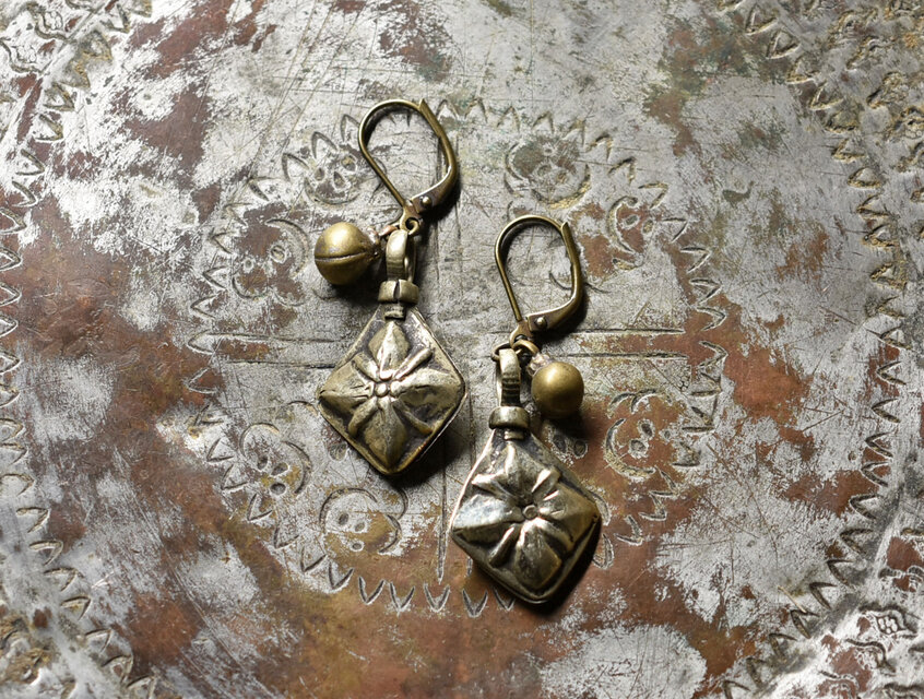 花模様oldアフガンパーツと民族鈴を繋いだピアスです。