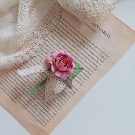 風情ある晒木綿の薔薇2輪、葉3枚にベージュベルベットリボンを結び、可愛いコサージュに仕上げました。