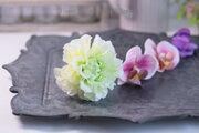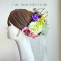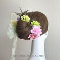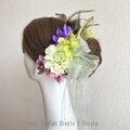 ダリアと胡蝶蘭と羽のヘッドドレス 成人式 和装婚 白 和装婚 髪飾り 神前式 羽 リボン 黄緑 ピンク