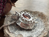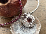 あふれ出るざくろの実のようなトップオレゴンサンストーンを中石に、果肉の粒々のようなガーネットのネックレスとシルバーチェーンをセットにした1点物ペンダントです。