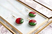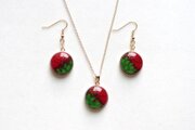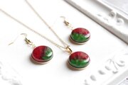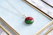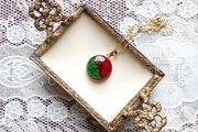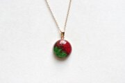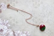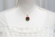 鮮やかな深紅の薔薇とみずみずしい緑色の葉っぱを描いたペンダント。
