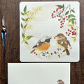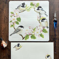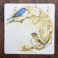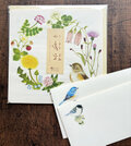 12種類の鳥たちが1枚づつと、表紙を飾る草花に囲まれたルリビタキの絵が2枚。