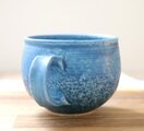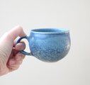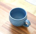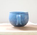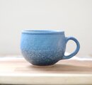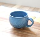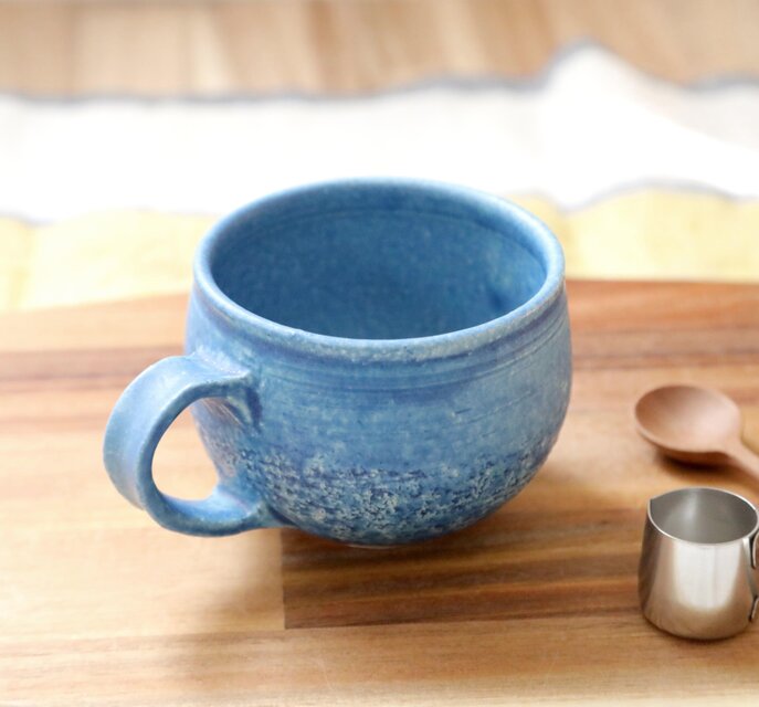空や海の色彩を思わせるマットブルーの釉薬と、素朴でざっくりとした質感の白陶土を合わせて制作したマグカップです。