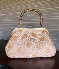 画像のように柄全体が菊の花びらが地になっていて、中心の花弁周りに少し色の濃い金糸がポイントになっています。決して華美ではなく、シックで上品な手提になっています。
