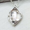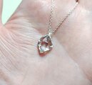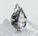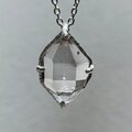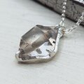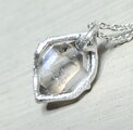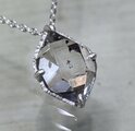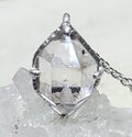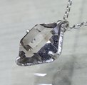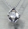 尖った両端や黒色インクルージョンは大地の力強さを感じさせるようです。今年のトレンドカラーを帯びたややスモーキーな色合いのNY州産ハーキマーダイヤモンド*原石そのものの美しさを活かしたシルバーペンダント、どんな服装にも合わせやすいシンプルなデザインです*カーボンや結晶インクルージョンが見られ原石故に少々擦れやチップもありますがますが光輝に優れとても透明度の高い結晶をお楽しみ下さい*輪郭に合わせて製作した石枠により透明度を最大限活かしました*ハーキマーダイヤは原石そのままの状態でカットされたような透明度と煌めきが特徴で高い人気と相反したNY州産減少により非常に入手困難となっております*925チェーン1.3㎜40㎝付き(長さのご希望がございましたら承ります)通常、黒化遅延処理を施しますが銀そのものの変化をお好みの場合は処理不要とお申し付けください*黒化防止ロジウムコーティング(最終画像下段色味参照)ご希望の場合はチェーンとともに承ります(別途1500円)