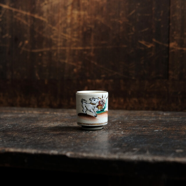 宝物を見つける白い犬(戌)◆九谷焼 色絵金彩覗き猪口 昭和レトロ 干支 酒器 コレクション 古民家 古道具 b3
