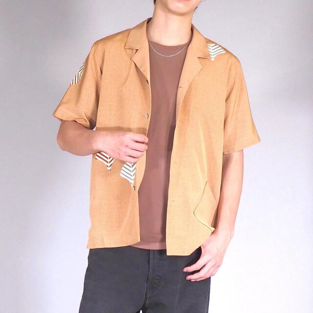 iichi価格★着物リメイク メンズシルクシャツM 山吹色 吉祥文様 扇 正絹着物