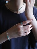スクエア型のターコイズがコーディネートのポイントに。つるんとしたカボションのターコイズブルーカラーは見ていると心まで晴れやかに。アリゾナ産のターコイズを使用しています。