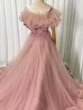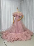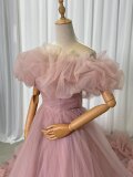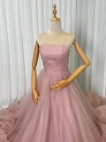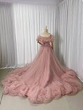 カラードレス 薄桃色 取り外しオフショルダー リボン ブライダル 可愛い 華やかなトレーン 結婚式