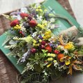 イチゴやベリーの赤い実とミモザ、ラベンダー