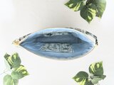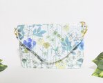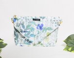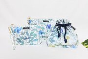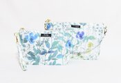 リバティのイルマ柄オフホワイト地にブルーの花柄、綿タナローン地の2Wayタイプ、持ち手付きで25cmファスナー使用の横長ポーチです。