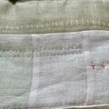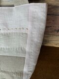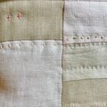 ベビーイエローのリネン生地を中心に生成り、薄グレー、ベージュのパッチワークに