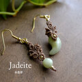 若草色やわらかな色合いが魅力的なミャンマー産本翡翠のアシンメトリデザインのマクラメ編みピアスです。優しいグリーンカラーが上品な印象の5月誕生石ヒスイの勾玉と丸玉をセレクトしました。