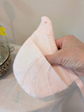 淡いピンクに染めた麻の薄い布に刺しゅうを施して羽部分を重ねて立体的に見せています