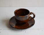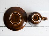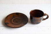 飴釉は写真だとどうしても光の影響をうけて白っぽく反射しますが全体がカンロ飴のように透明感のある茶色です。濃い部分は鉄をうって文様にしています。