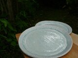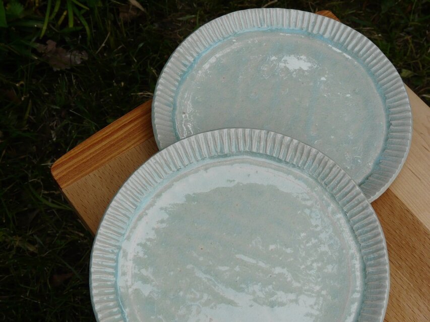 灰釉のぎざぎざ線のふちどりの皿です