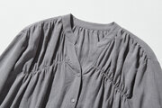 V型のスキッパーカラーが首元をすっきりと見せ、着やすさとスタイリッシュさを両立。天然素材の貝ボタンが綿麻の素朴な風合いと調和し、洗練されたナチュラルテイストを演出しています。