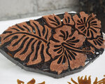 南国らしいハイビスカスのモチーフの銅製のスタンプに熱した蝋をつけ、布地にひとつずつ模様をつけて染めています。