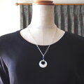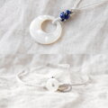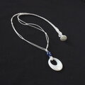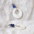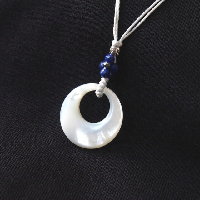 美しい照りが見られるドーナッツ型のホワイトシェルにカットがキラリと輝く紫を帯びた濃いブルーのラピスラズリとシルバー色のヘマタイトを合わせ、アクセントにフラワー模様が入ったカレンシルバーを添えてトップに配した上品な雰囲気のペンダントです。