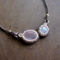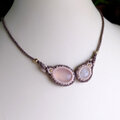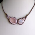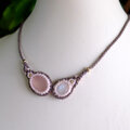 透明感があり、ほんのり桜色で艶やかで上品な色合いが美しいマダガスカル産ローズクォーツと小粒ながらも青く光り輝くブルーシラーが現れるスリランカ産ムーンストーンを合わせたマクラメ編みペンダントネックレスです。