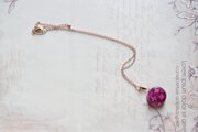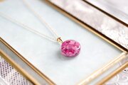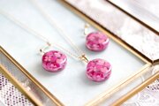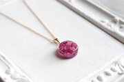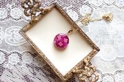 何層にも重ねたピンク色の紫陽花の花びらがなんとも可憐で華やかなペンダント。